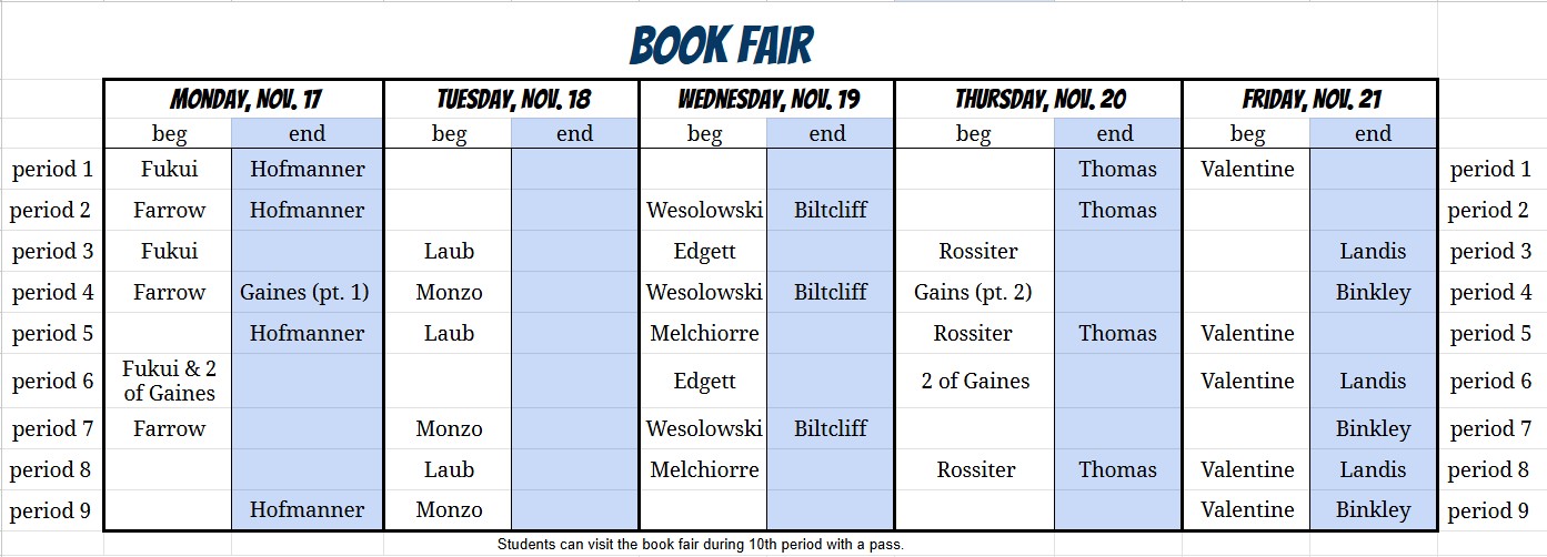 It’s book fair time! Students will have the opportunity to shop at the book fair in school during the week of November 14-24. Each ELA class will visit the book fair, but students may also visit the fair during study halls to make purchases.